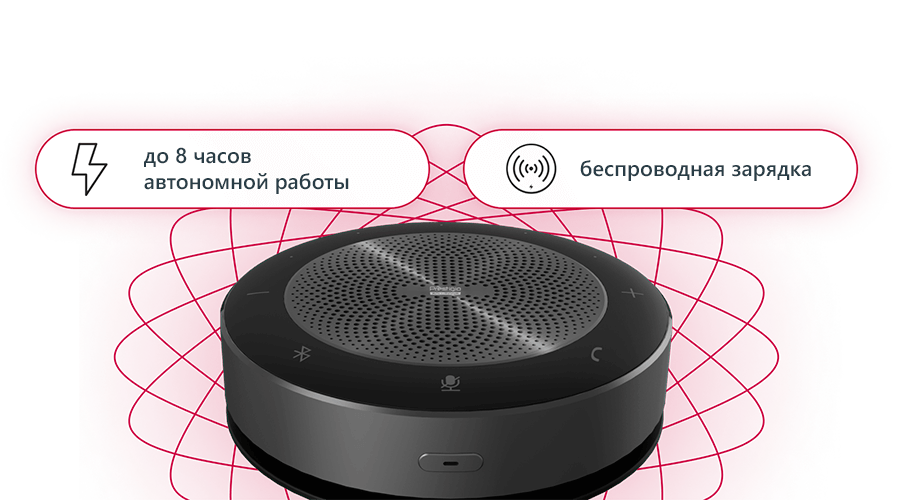 Мощный встроенный аккумулятор позволяет Speakerphone работать в автономном режиме до 8 часов. Функция беспроводной зарядки освободит вашу переговорную комнату от лишних проводов и постоянного подключения.